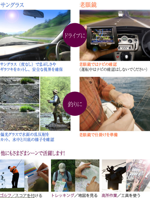 まぶしい日差しの中サングラスを掛けながらのドライブやゴルフ、釣りなど、近くの物を見るときに不自由を感じたことはありませんか? 「老眼鏡がほしいなー」と思って掛け替えても、またサングラスに掛け替える・・・「あー、なんて面倒なんだ!」。そんな時サングラスと老眼鏡が一つになった 「ダウンビューバイフォーカルグラス」が重宝します。