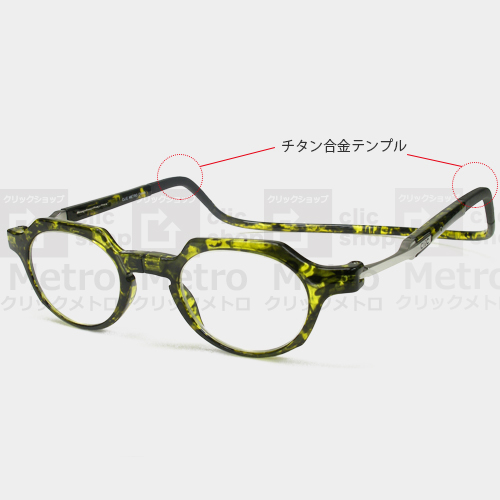クリック メトロは、テンプル(メガネの左右ツル部分)パーツの耳に掛かる部分が、ゴムのように形状を変えられる仕様になっており、ご使用されるお客様のお顔や頭部の形、耳の位置に合わせてご自身で掛心地を調整することが可能な製品です。なお、調整域には限りがございます、当品の実寸/サイズをご確認ください。